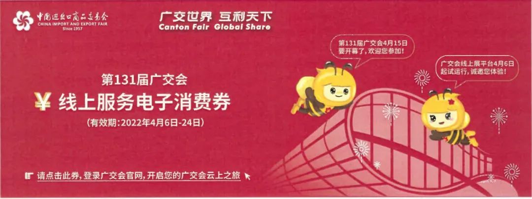 由于疫情的影响,本届广交会不向参展企业、跨境电商平台收取费用。本届参展企业将发放线上服务电子消费券,(查收路径:参展易捷通—信息快道—收件箱)登录广交会线上展平台后就可以免费参展啦!
